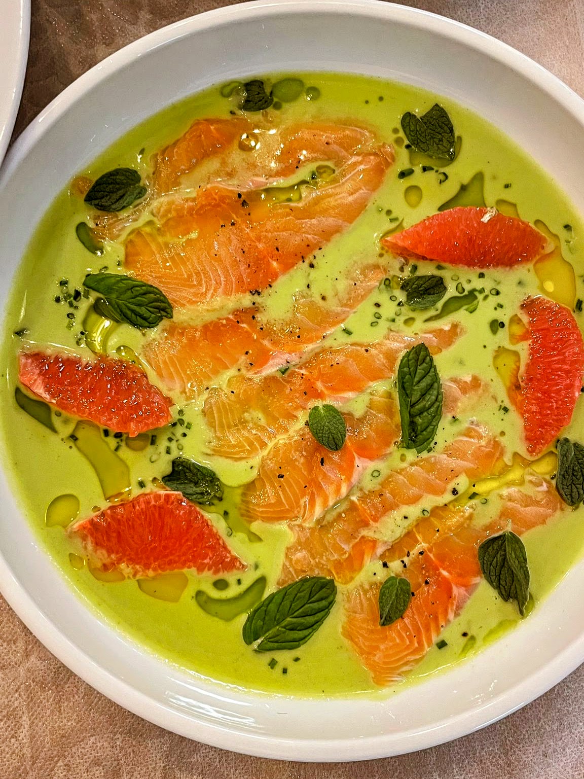 קרפצ’יו דג סלמון, רוטב טופי סויה, תפוז וסלט ארוגולה ומלפפונים.
