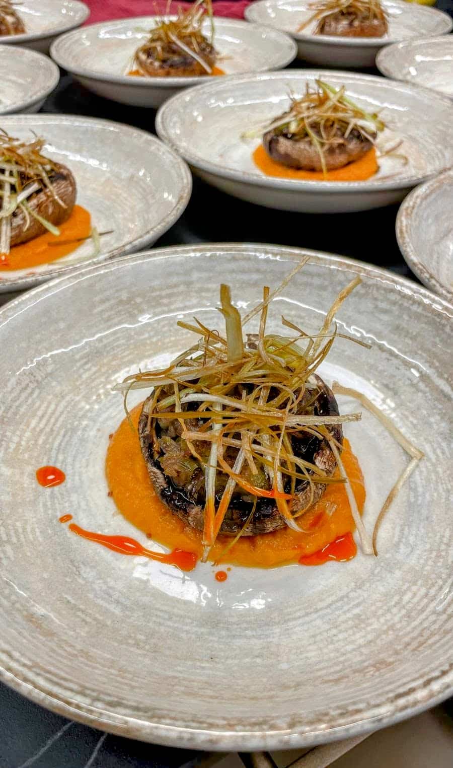 פטריות שמפיניון במילוי, פילה בקר, עשבי תיבול ,כרישה מוקפצת שבבי שקדים וקרמל סויה.