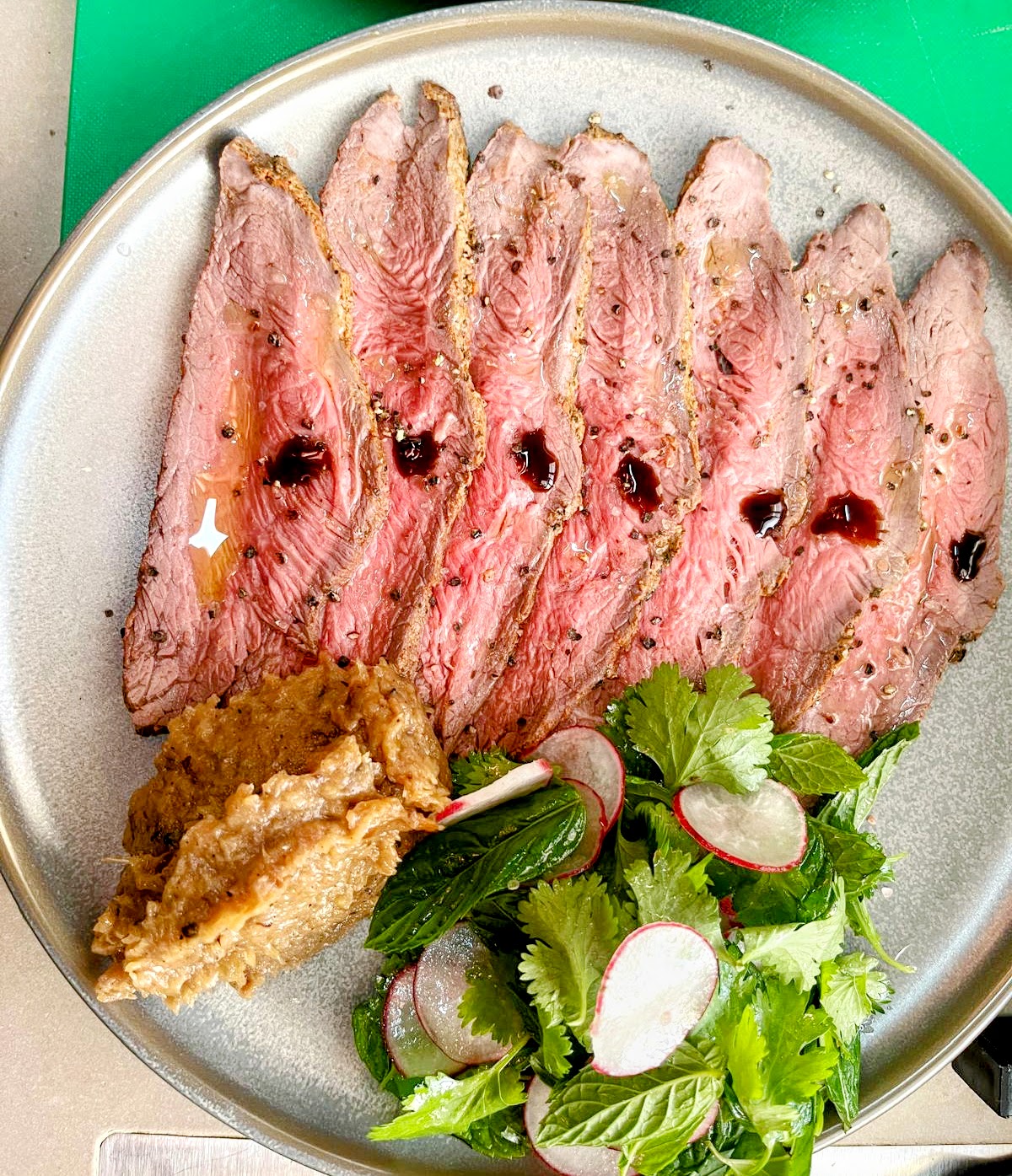 אנטריקוט מיושן 24 ימים, כרוב סגול בבירה, וגרטן תפו”א.