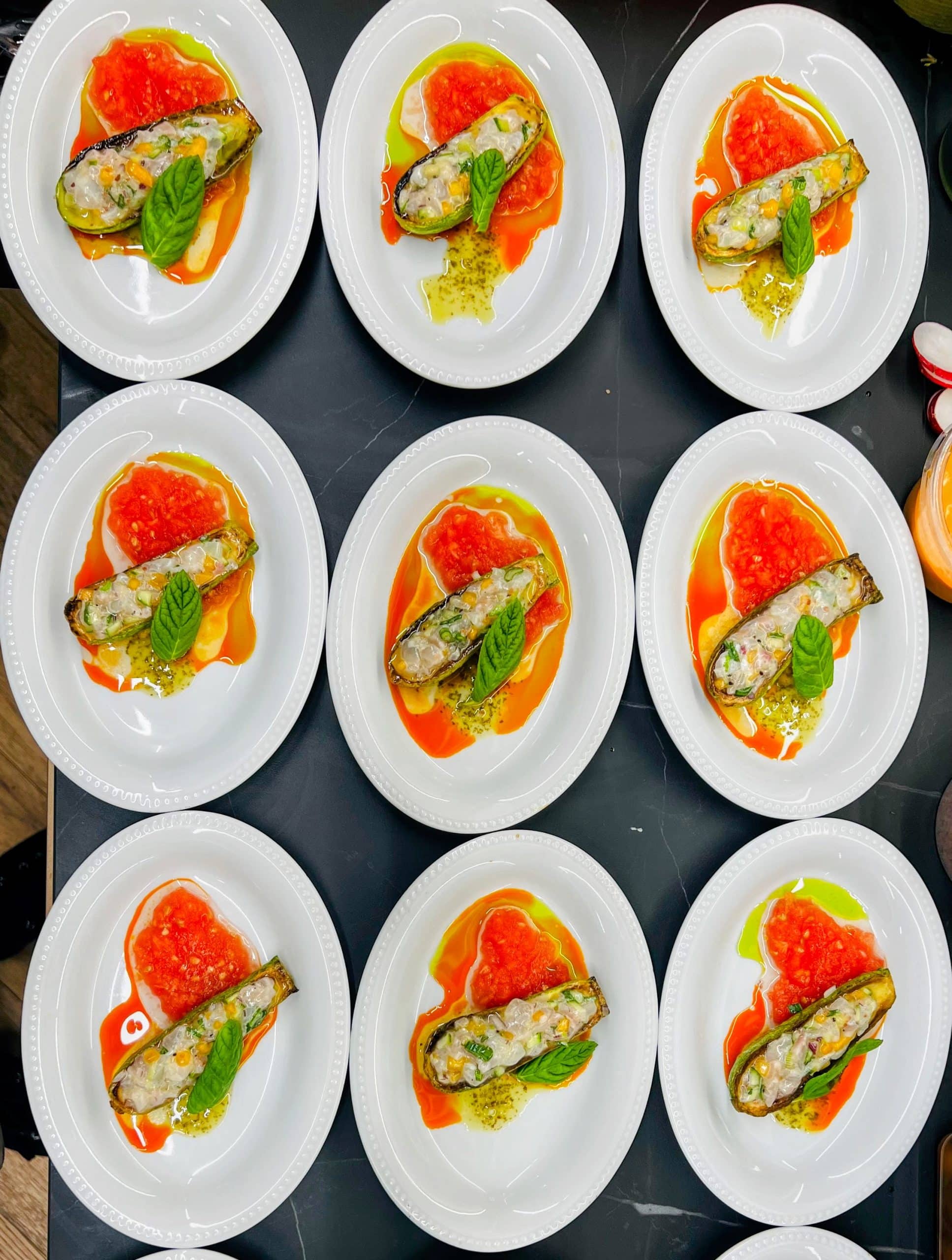 סביצ’ה דג ים בייבי קישוא צלוי, נענע, בצל ירוק ועגבנייה סחוטה.